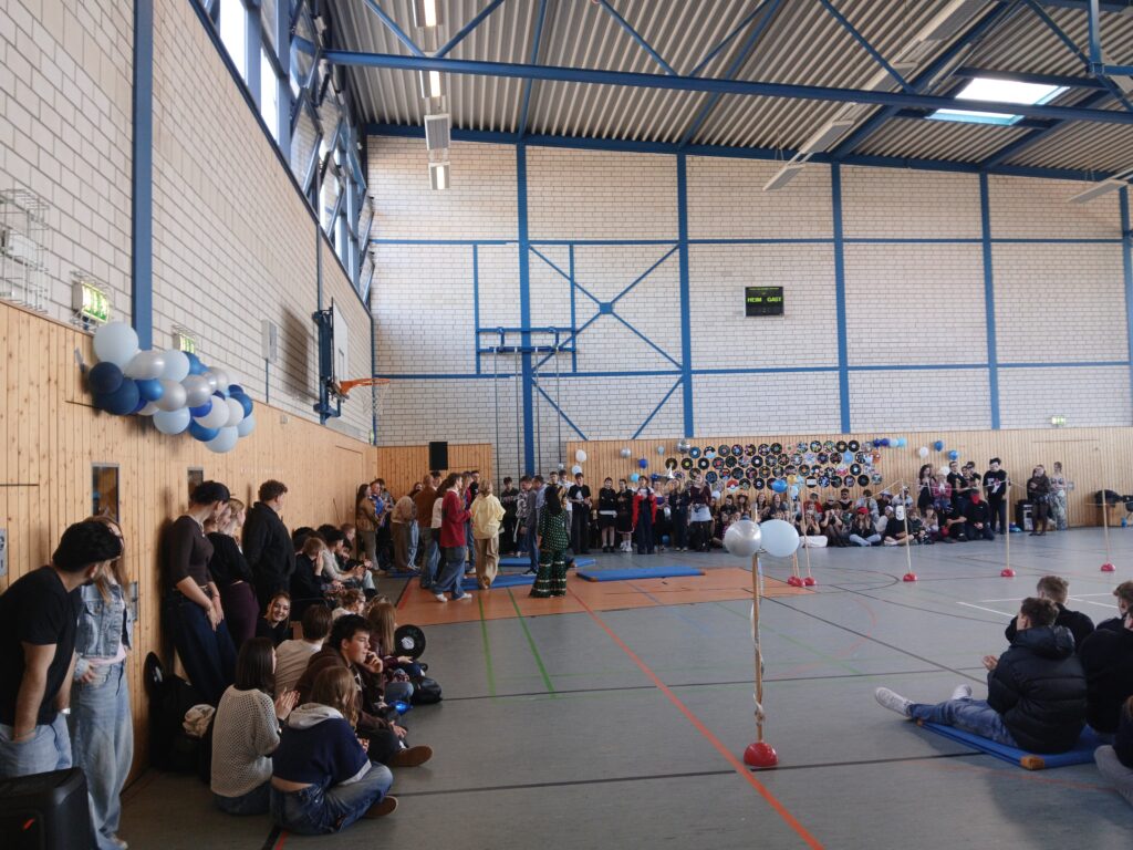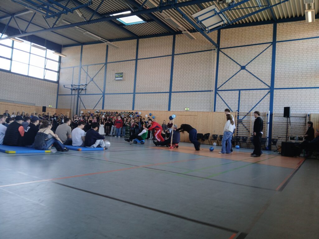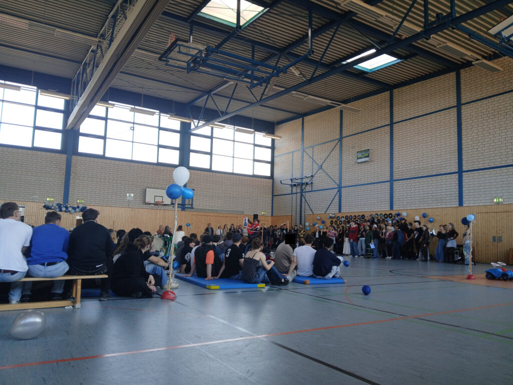 Zum zweiten Block folgte dann die große Überraschung für alle Anwesenden. In Absprache mit der Schulleitung wurden alle Schüler der GOST aus den Räumen geholt und in die Sporthalle gebracht. Dort wartete dann erst die richtige Party und ein Programm, das von der ersten Sekunde an für beste Stimmung sorgte. Den Anfang machte ein lustiges Ratespiel mit Kinderfotos der Lehrer. Es war unfassbar lustig zu sehen, wie die Lehrer versuchten, ihre Kollegen auf den alten Bildern zu erkennen.